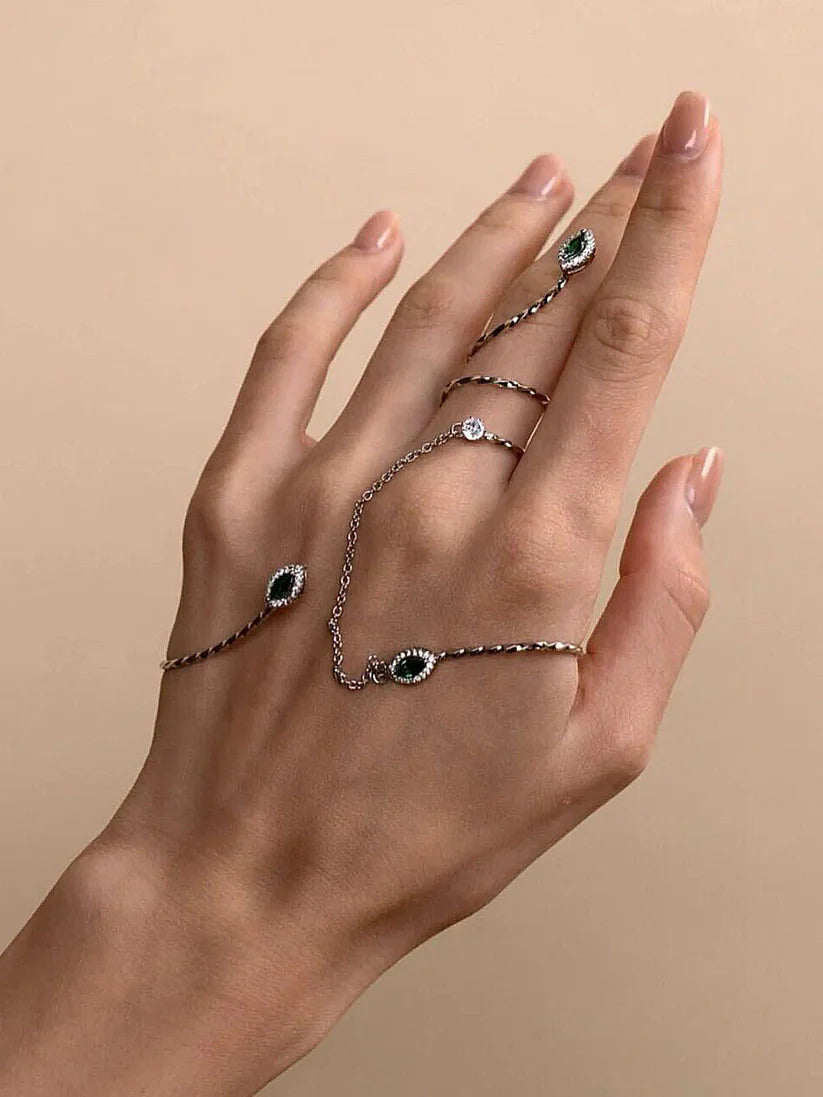 With its entwined rings and glistening emerald stones, this hand chain captures the poetry of movement and the strength of subtlety. It’s a jewel for the muse, the mystery, the woman who knows that elegance doesn’t ask for attention—it effortlessly owns it.
