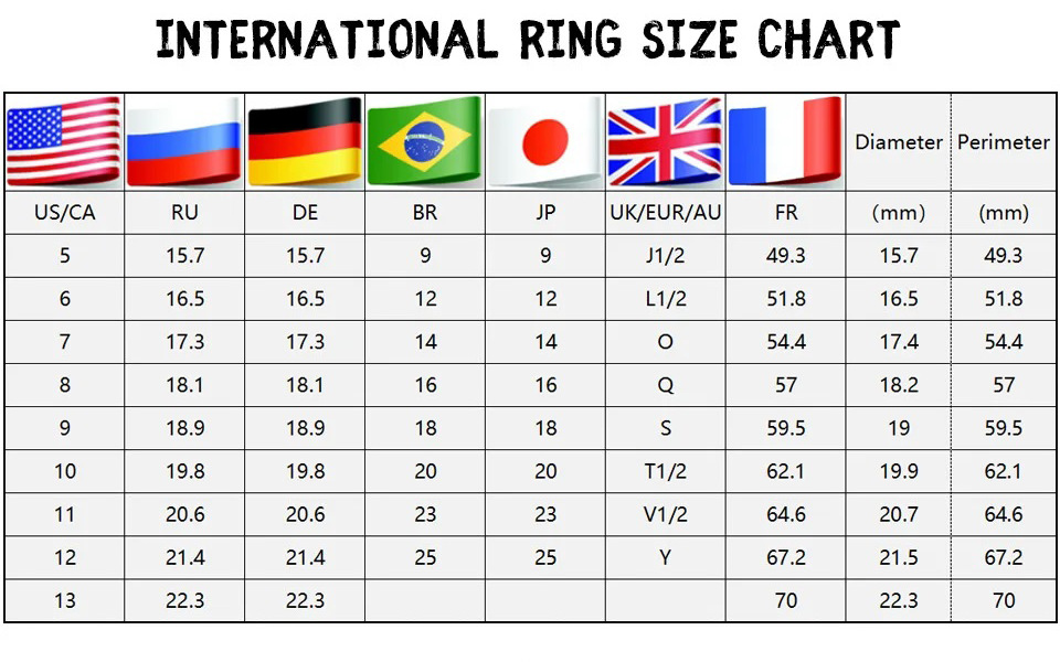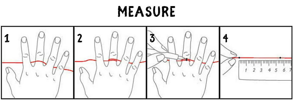 To measure the ring size using a ring that fits, you need measure the internal diameter of the ring. Write down this measurement in millimeters, and use the conversion chart below to find your ring size. If you don't have a ring to use, follow these easy steps: